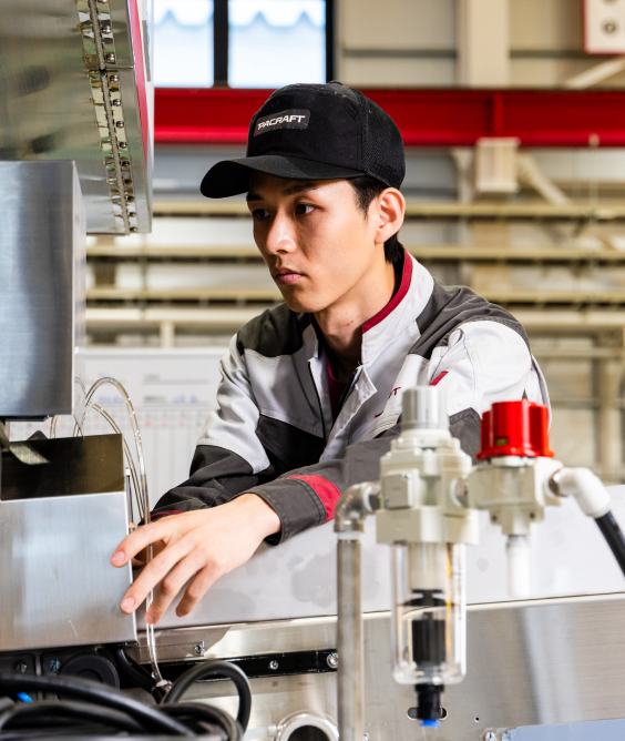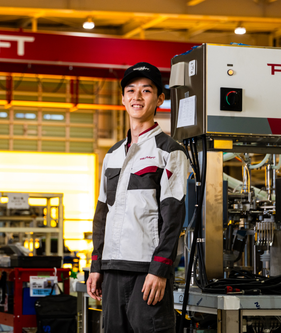 PACRAFTを知ったのは、高校が実施した企業見学プログラムに参加したのがきっかけでした。その時に訪問した岩国工場で、実際に包装機を組み立てる様子やテスト稼働している機械を目にして、身近な製品をつくる機械の製造に携わりたいと考えるようになりました。